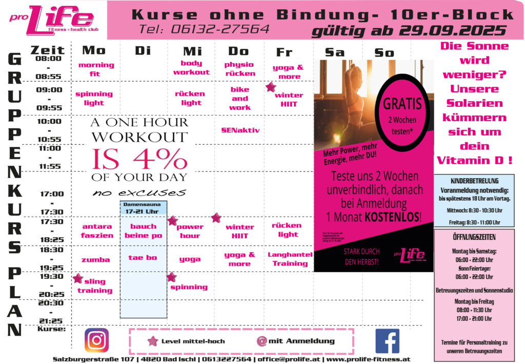 Mit einem riesigen Gruppenraum (200m2) findest du optimale Trainingsvoraussetzungen, unter denen dir nicht die Luft ausgeht. Wir bieten den umfangreichsten Gruppenstunden Plan im Salzkammergut an. Ob Yoga, Spinning, Rückenfit, Bauch-Beine-Po, Taebo, Langhanteltraining. Bei unserer riesigen Auswahl findest du bestimmt deine passende Fitnessstunde mit Gleichgesinnten. Zudem bieten wir zusätzliche Gruppenstunden über unsere TVs an. Somit kannst du von Montag bis Sonntag an Gruppenstunden teilnehmen.